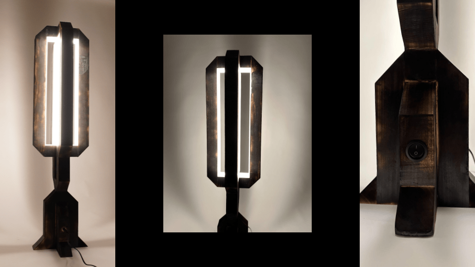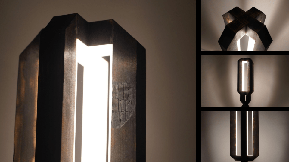 - A custom wooden lamp exhibiting a unique product design & burned finish